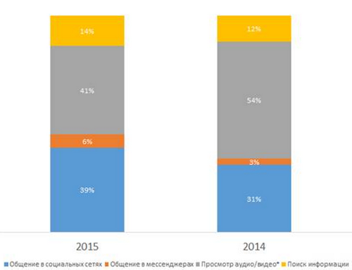 Личное общение школьников в мобильном интернете вытесняет поиск информации в структуре потребления трафика . Максимальный, двукратный рост продемонстрировала доля мессенджеров - с 3% до 6% гг. Трафик соцсетей вырос на 8 пп до 39% с 31% гг. При этом доля трафика, приходящаяся на поиск информации увеличилась на 2 пп, с 12 до 14%.